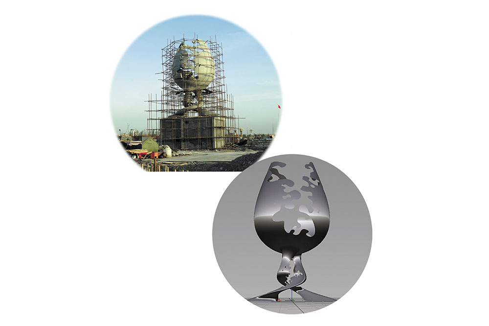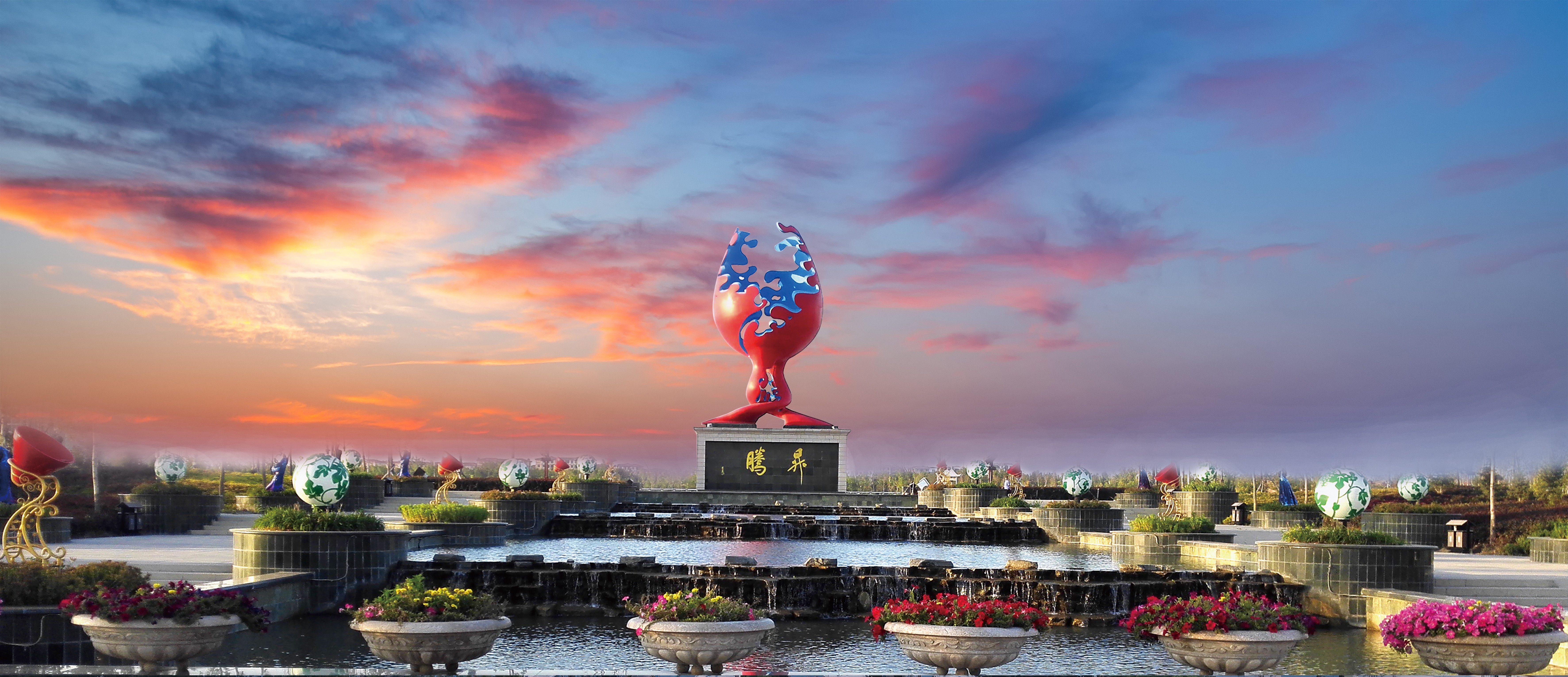 一座优秀的雕塑往往成为一个国家、一座城市、一片空间环境的标志。玛纳斯是著名的“酿酒葡萄之乡”。通过升腾主雕,在城市重点公园展现县域一产葡萄种植,二产葡萄加工,三产酒庄旅游的产业联动内涵,塑造县域发展特色的地标形象。雕塑取蓝色的玛河浪花,红色的葡萄佳酿为元素,交融上升组合成写意的葡萄酒杯,以升腾激昂的形态寓意玛纳斯县各项事业、文化、生活水乳交融,蒸蒸日上。