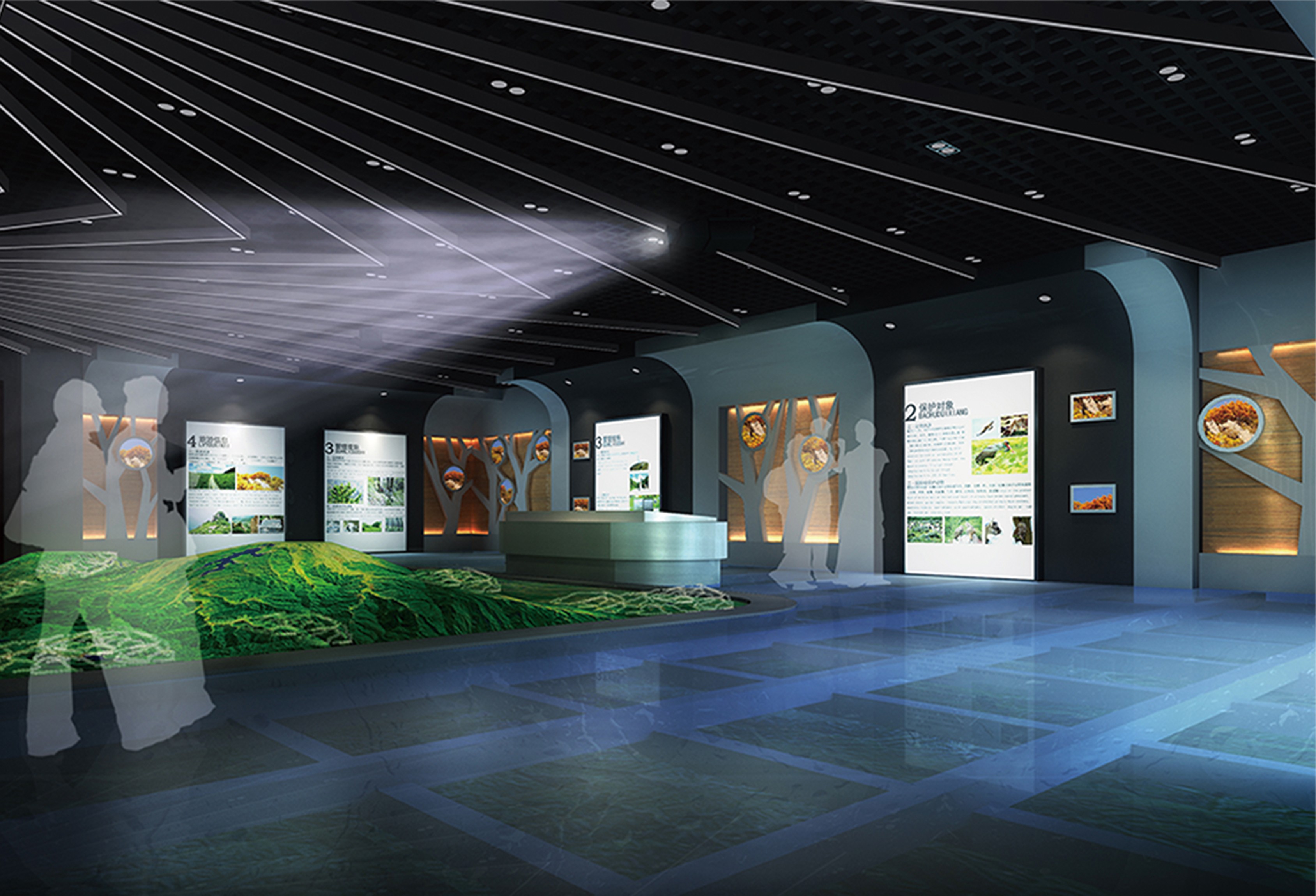 展馆一提取百花山原始松林为造型元素,馆内四个树型迎宾柱,将游众带入百花山林海空间。展示区域共有“百花迎宾、曾经沧海、锦簇攒天、山花烂漫”四处主题景观