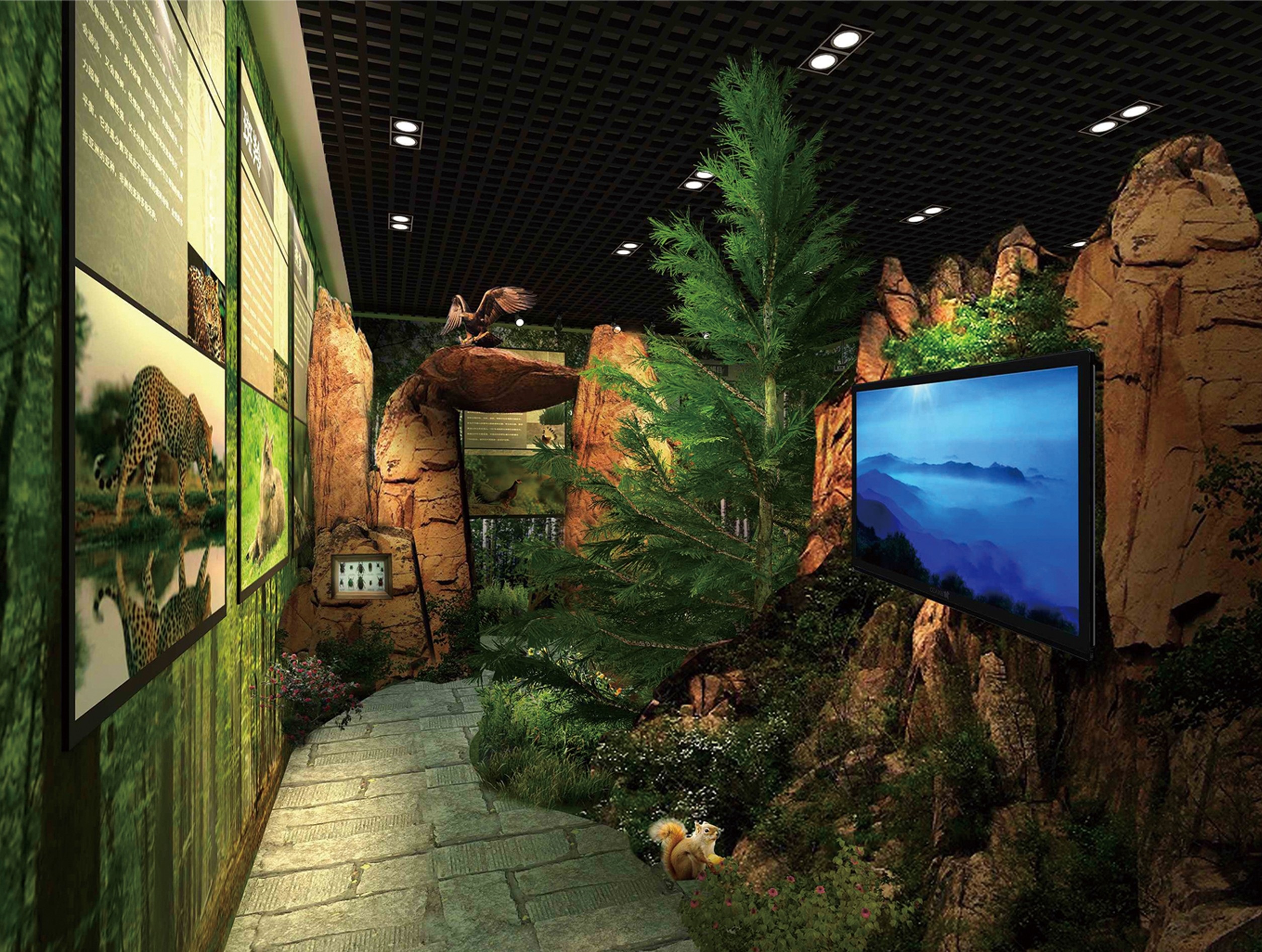 展馆一提取百花山原始松林为造型元素,馆内四个树型迎宾柱,将游众带入百花山林海空间。展示区域共有“百花迎宾、曾经沧海、锦簇攒天、山花烂漫”四处主题景观,功能区域设置阅读与问询处。展馆二以百花山风光“借境寓情”,聚石为山,环水为池,通过叠山理水,栽植花木,安置动物标本,集中塑造百花山的秀丽风貌,达到缩龙成寸、小中见大的艺术效果,同时将各种科普知识与关爱生命的主题融入其中,实现宣教目的。