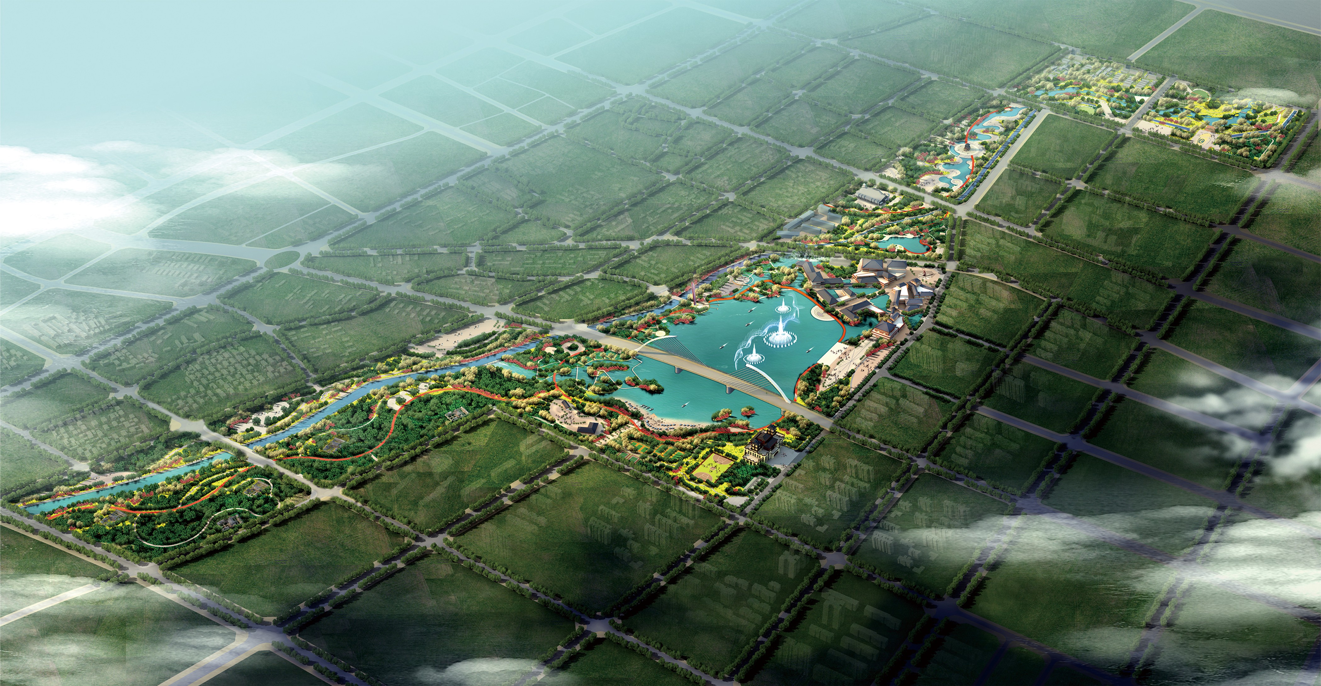 庭州湾即吉木萨尔县东沙河,原位于城市建成区的边缘地带,是主要的泄洪通道。随着城市发展的加快,逐步成为城市新区发展重要的空间依托,也是城市从外延扩张向内涵提升转型的重要空间。项目规划以水系治理和生态修复为基础,以庭州湾景观带为支点,以“十里沙河画卷,千年时空水岸”为定位,挖掘北庭文化精髓,融入汉风唐韵,突出城市特质,塑造了独特魅力的滨水公共开放空间,形成新区发展的重要引擎地段。