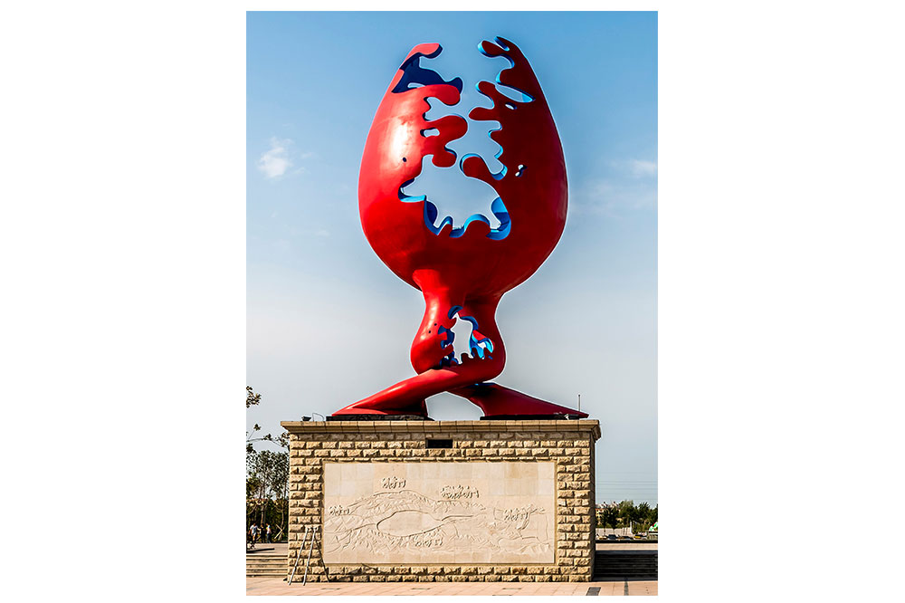 一座优秀的雕塑往往成为一个国家、一座城市、一片空间环境的标志。玛纳斯是著名的“酿酒葡萄之乡”。通过升腾主雕,在城市重点公园展现县域一产葡萄种植,二产葡萄加工,三产酒庄旅游的产业联动内涵,塑造县域发展特色的地标形象。雕塑取蓝色的玛河浪花,红色的葡萄佳酿为元素,交融上升组合成写意的葡萄酒杯,以升腾激昂的形态寓意玛纳斯县各项事业、文化、生活水乳交融,蒸蒸日上。