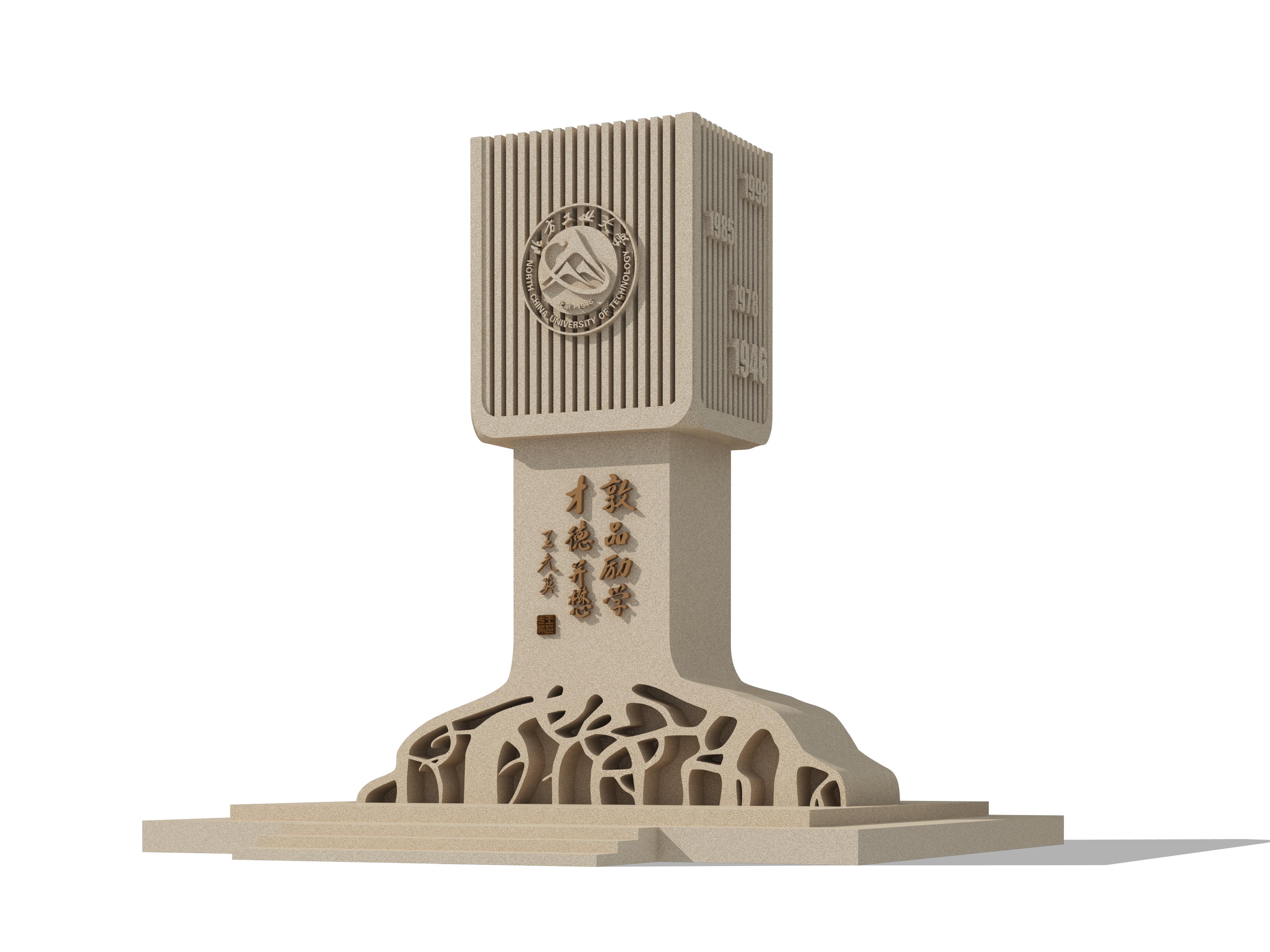 “十年树木,百年树人”,在北方工业大学建校70周年之际,设计校训树,整体造型以抽象化的“大树”为原型,“树根”深根固柢,“树干”明示校训,“树枝”展示校标。三部分构成
