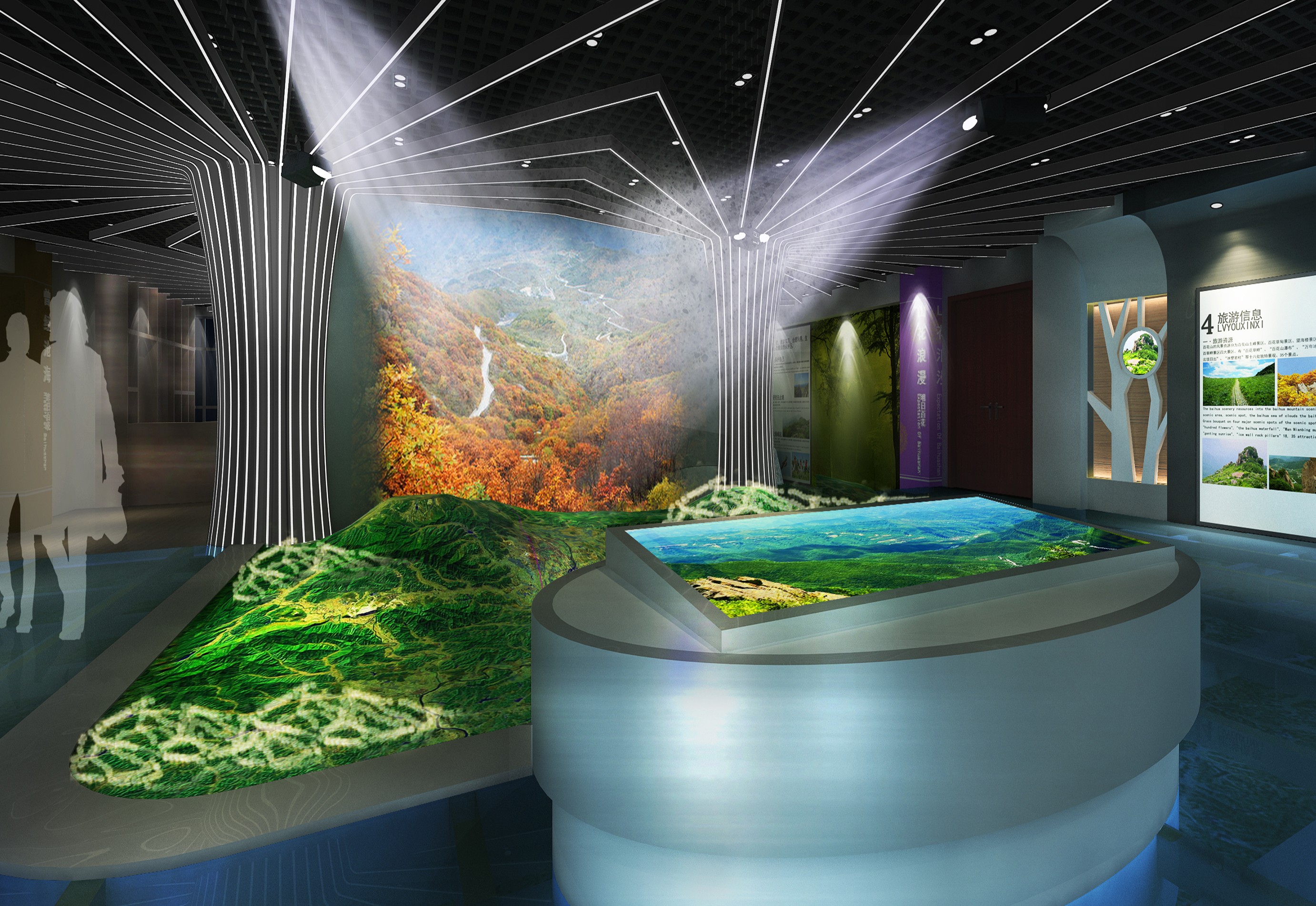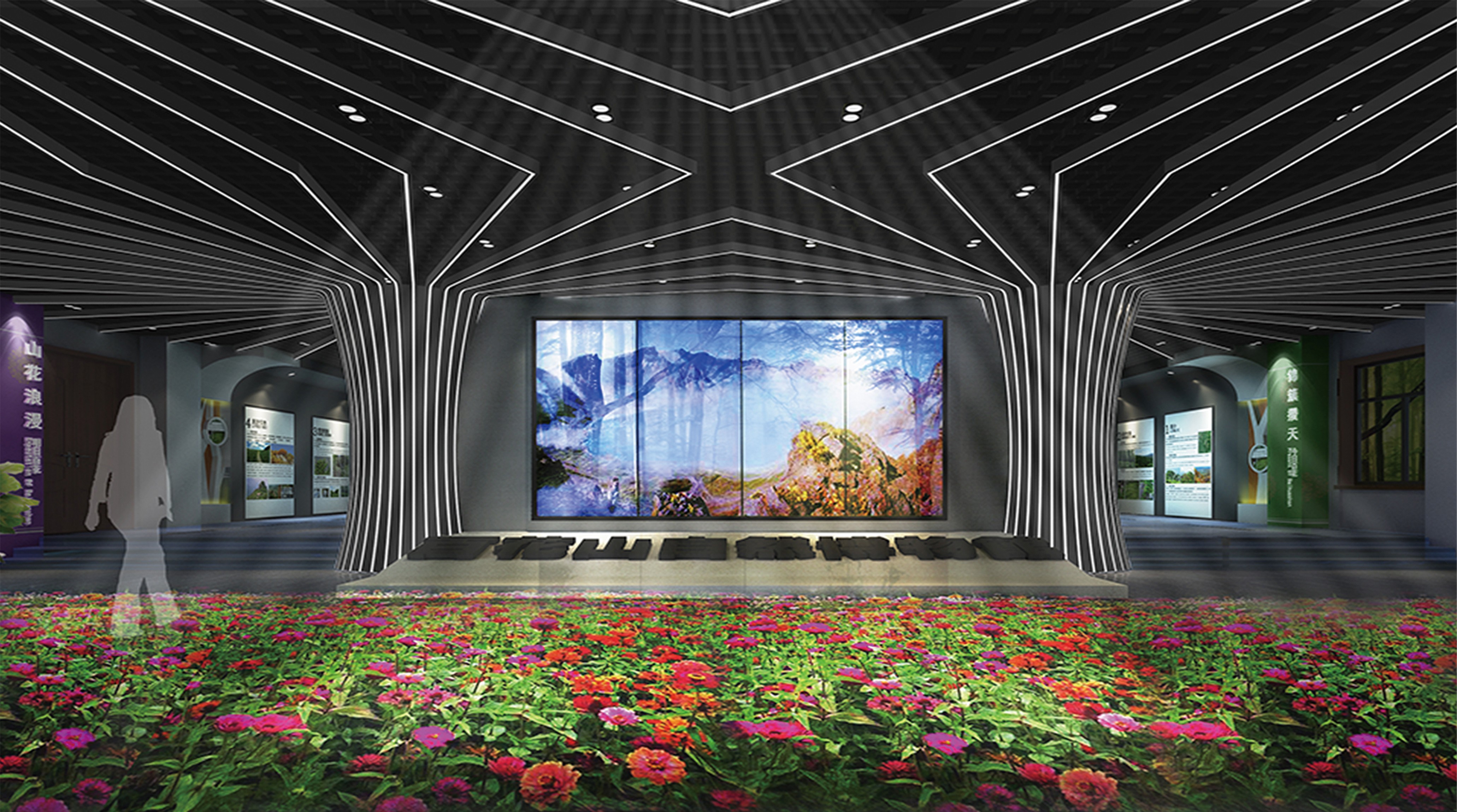 展馆一提取百花山原始松林为造型元素,馆内四个树型迎宾柱,将游众带入百花山林海空间。展示区域共有“百花迎宾、曾经沧海、锦簇攒天、山花烂漫”四处主题景观